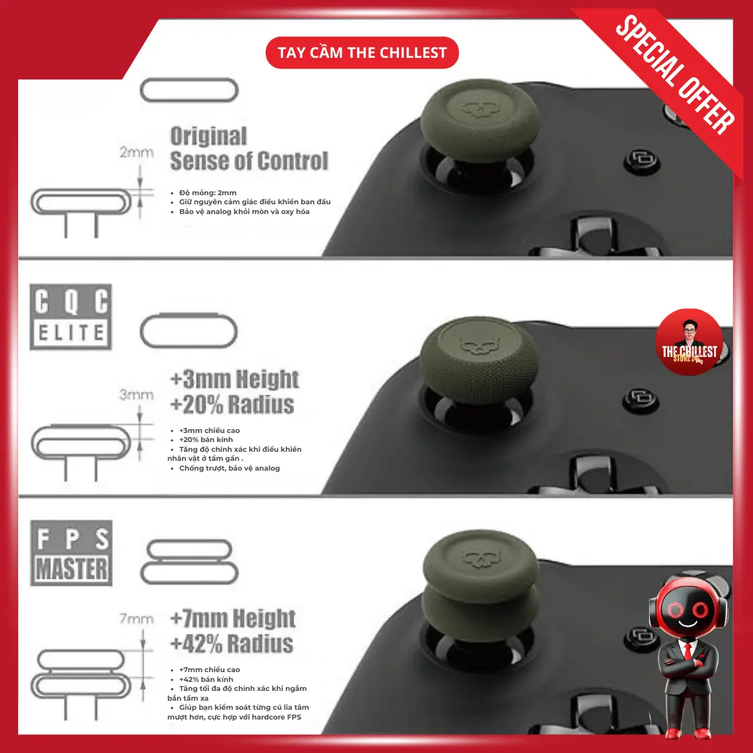 + Skin Grip: mỏng, giữ cảm giác analog gốc + CQC Elite: +3mm chiều cao, +20% bán kính + FPS Pro/Master: +7mm chiều cao, +42% bán kính |
