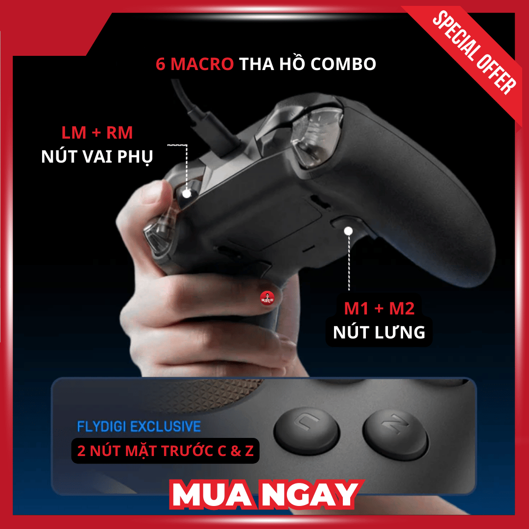 Nút phụ: 6 nút (2 nút lưng, 2 bumper phụ, 2 nút mặt C + Z độc quyền Flydigi)